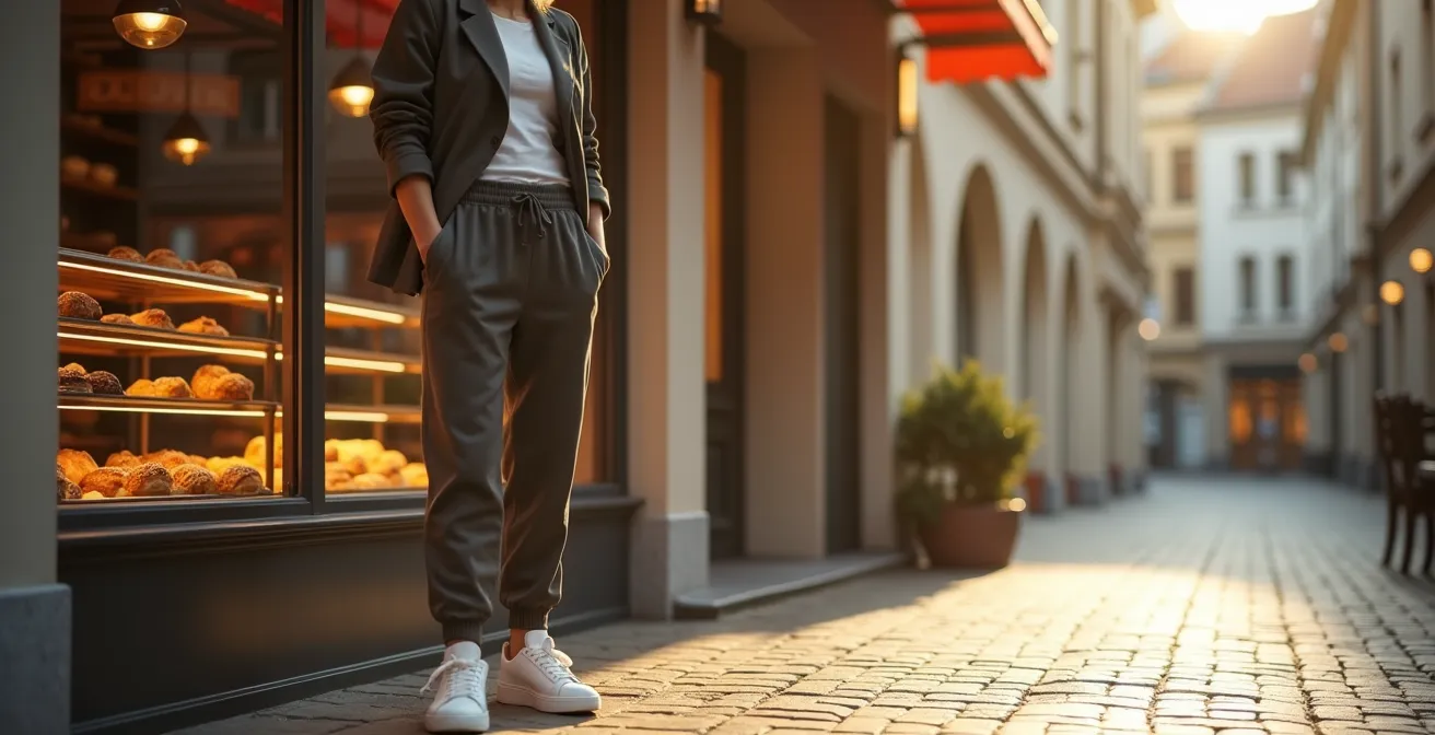 - Das Geheimnis liegt in einer Systematik: Kombinieren Sie Ihre Komfort-Basis (Jogginghose) mit einem Struktur-Anker (z.B. Blazer) und bewussten visuellen Signalen der Gepflegtheit.
